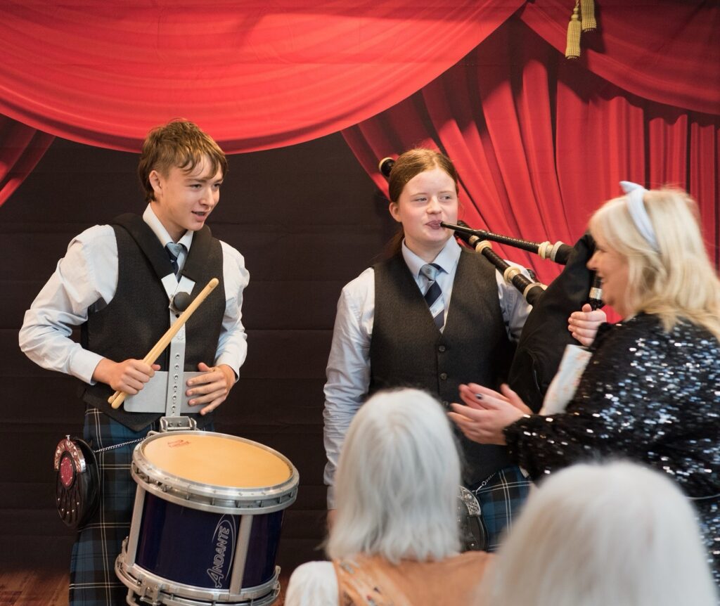 A highlight of the day was 96-year-old resident Billy Mackintosh [headline picture], formerly the band leader, vocalist and accordionist of the Billy Mackintosh Dance Band, formed in 1950. Billy returned to the stage for a duet of There’s a Hole in My Bucket with Wellbeing Coordinator Fiona Stoddart.