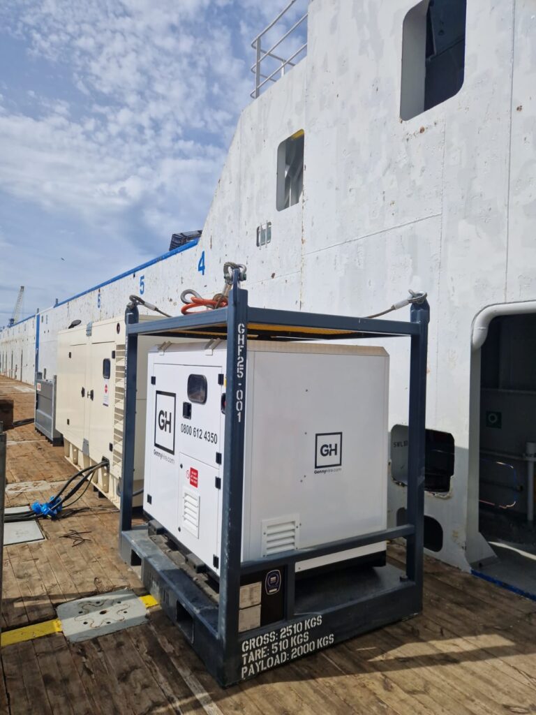 In a first for the marine sector, Genny Hire mobilised a punch unit alongside a 300 kVA generator to assist a vessel undergoing repairs. Rather than deploying a larger generator, the compact setup allowed the team to support the boat in adjusting anchors to suit tidal conditions. The approach was efficient, reducing fuel consumption and the logistical footprint, while delivering reliable power exactly when and where it was needed.